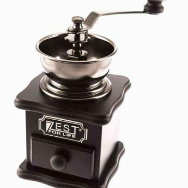 Tradycyjny młynek ręczny, w drewnianej obudowie koloru czarnego z praktyczną szufladką na zmieloną kawę. Młynek wyposażony jest w mechanizm mielący wykonany z żeliwa, dzięki czemu jest on bardzo trwały i precyzyjny. Ponadtomechanizm posiada regulację mielenia, więc sami możemy decydować jaki stopień zmielenia ziaren chcemy uzyskać. Ręczne mielenie ziaren kawy jest znacznie lepszym sposobem niż przy użyciu młynków elektrycznych, gdyż mechanizmy w młynkach ręcznych nie nagrzewają się, dzięki czemu zmielona kawa jest bardziej aromatyczna. Młynki marki Zest for Life zostały wyprodukowane z myślą o miłośnikach świeżo zmielonej i aromatycznej kawy, a ich jakość jest wysoko oceniana przez użytkowników.