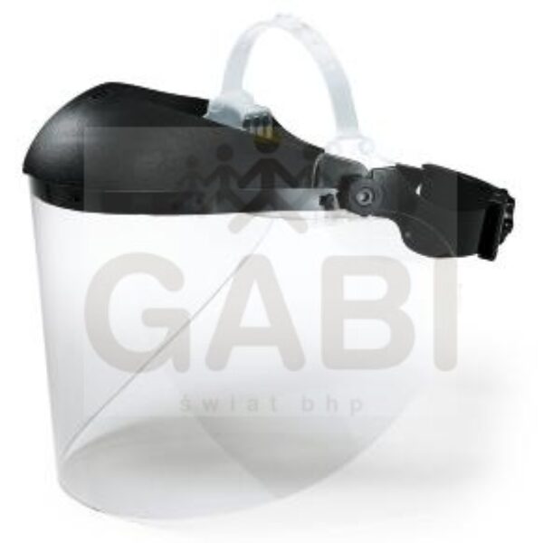 Lekka przeciwodpryskowa osłona twarzy z dołączoną osłoną na czoło, ze stabilną w każdym położeniu unoszoną do góry szybą, z mechanizmem regulującym mocowanie za pomocą pokrętła