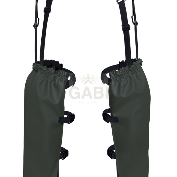 Nogawice wodoochronne z wkładkami na nakolanniki, mocowane do paska za pomocą regulowanych zapięć