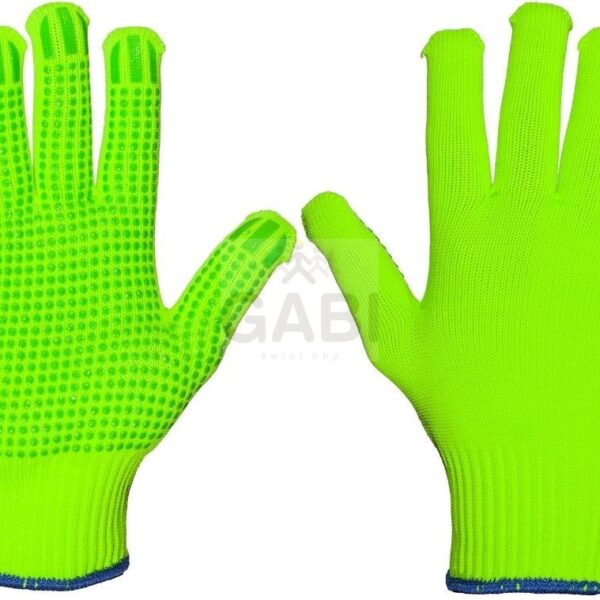 Rękawice poliestrowo-bawełniane, w kolorze jaskrawozielonym, pokryte punktowo PVC, ścieg 10G