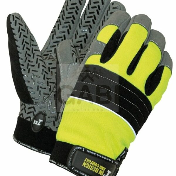 Szyte rękawice Hi-Vis wykonane z mieszanki poliestru i Spandexu wzmacniane syntetyczną skórą w części chwytnej i na koniuszkach palców