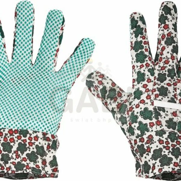 Rękawice szyte z barwnej tkaniny bawełnianej, nakrapiane PVC w części chwytnej dłoni i na palcach