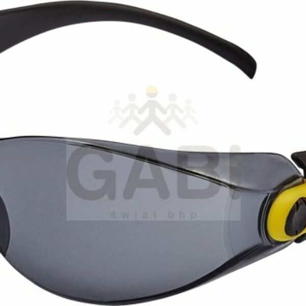 Okulary z szybkami poliwęglanowymi, regulowany kąt nachylenia i długość ramion, sportowy wygląd, szybki nieparujące i odporne na zarysowania, klasa F według normy EN 166 - ochrona przed odpryskami ciał stałych o niskiej energii uderzenia, klasa optyczna 1, szare szybki z filtrem UV według normy EN 172