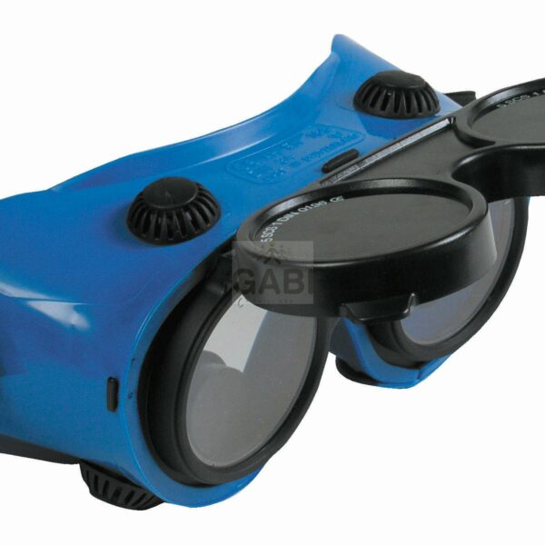 Niebieskie gogle ochronne z podnoszonymi okrągłymi szkłami klasy F