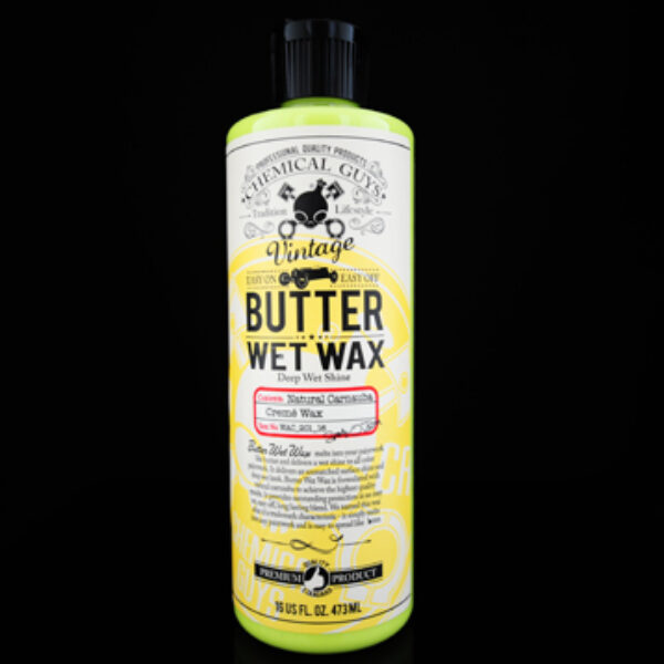Chemical Guys Butter Wet WaxAbsolutny 'wet look' to podstawowe zadanie tego produktu. Unikalna mieszanka polimieru i wosku Carnauba pozwalają na osiągnięcie efektu tafli wody na lakierze. Jego zaletą jest również łatwość i przyjemność pracy. Nie pozostawia śladów na gumie i elementach plastikowych. Nie zawiera żadnych właściwości ściernych. Lakier otrzymuje głębię koloru i jest chroniony najtrwalszym naturalnym woskiem świata. Zobacz jak działa http://www.youtube.com/watch?v=ylKCdpGO4zU Pojemność: 473ml