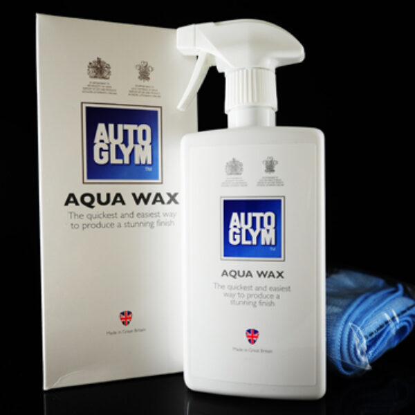 AutoGlym Aqua Wax Kit Aqua Wax marki Autoglym jest super szybkim produktem przeznaczony do otrzymania genialnego połysku (bez żadnych smug) na wszystkich zewnętrznych powierzchniach, nawet jeśli pojazd jest mokry po myciu. Bezpośrednią korzyścią jest to, że nie ma potrzeby wycierania do sucha samochodu między myciem i polerowaniem.Brylantowy wysoki połysk wykończenia może zostać osiągnięty w ciągu ułamka zwykłego czasu.Produkt zawiera wosk Carnauba co wpływa na wyjątkową trwałość połysku. Aqua Wax jest odpowiedni do wszystkich rodzajów lakierówmetalicznych oraz gumy, tworzyw sztucznych i szkła.Wysokowydajny. Na jedną aplkacje samochodu śrdniej wielkości (Audi A4 Avant) potrzeba ok. 15 ml. Opakowanie wystarczy więc na ok. 30-40 woskowań.Po umyciu auta i lekkim wytarciu należy spryskać lakier niewielką ilością Aqua Wax a następnie jedną microfibrą przetrzeć powierzchnię a drugą wypolerować. Idealny środek, wożony w aucie , umożliwia utrzymanie lakieru w nienagannej czystości i extra połysku. Czynność należy powtarzać co 3-4 mycia (częściej nie zaszkodzi) gdyż produkt nie ma takiej samej wytrzymałości jak czysty wosk. Jednak ze względu na swoje bardzo praktyczne cechy użytkowe należy do jednych z najbardziej popularnych kosmetków na Wyspach.W zestawie 2 mikrofibryPojemność: 500 ml