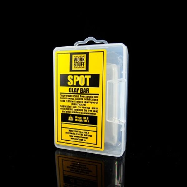 Work Stuff Spot Clay Bar Wysokiej jakości glinka przeznaczona do oczyszczania lakieru.Najważniejsze cechy:Biały kolor ułatwiający kontrolowanie procesu oczyszczaniaNiezwykła efektywnośćPoręczne pudełko do przechowywaniaWaga: 100gTwardość: średnia