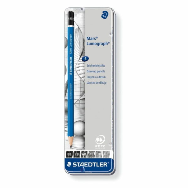 ZESTAWY OŁÓWKÓW STAEDTLER MARS LUMOGRAPH 8B-HB 6 SZT W METALOWEJ KASETCE SZEŚCIOKĄTNY OŁÓWEK DO PISANIA, SZKICOWANIA I KREŚLENIA ODPORNY NA ZŁAMANIA DZIĘKI KLEJONEMU NA CAŁEJ DŁUGOŚCI GRAFITOWI. ZESTAW S 100 G6 ZAWIERA 6 OŁÓWKÓW: 8B, 7B, 6B, 4B, 2B, HB (NIEBIESKIE)