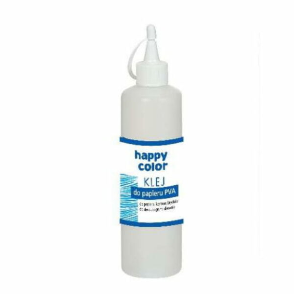 Klej do papieru PVA bezbarwny 100g Happy Color:- uniwersalny klej introligatorski na bazie octanu winylu- idealny do papieru, kartonu, brystolu, do decoupage na drewnie- do wszystkich papierowych technik hobbystycznych takich jak scrapbooking, quilling, ręcznie robione kartki- krótki czas schnięcia, kartka papieru - pierwsza spoina po około 5 minutach, karton - po około 10 minutach- wysoka penetracja kleju zapewnia wytrzymałą, elastyczną spoinę odporną na kruszenie, nie niszczy powierzchni papieru, nie powoduje falowania po wyschnięciu- po wyschnięciu całkowicie przezroczysty Klej nadaje sie do zastosowania w tworzeniu glutów, slime