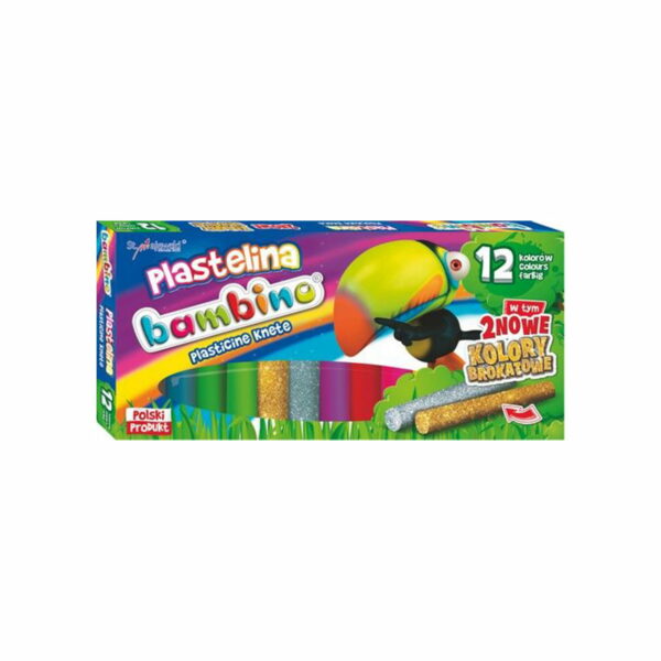 Plastelina Bambino to wysokiej jakości masa plastyczna. Jest elastyczna, nie brudzi rąk, nie przywiera do podłoża, łatwo się modeluje, pozwala na tworzenie prac metodą millefiori. Nie wysycha na powietrzu, przez co może być wykorzystywana wielokrotnie. Gama kolorów jest szeroka, barwy żywe, nasycone. Opakowanie zawiera dwa nowe kolory brokatowe - srebrny i złoty. Plastelina jest bezpieczna, ponieważ produkowane jest w zgodności z dyrektywą Parlamentu Europejskiego i Rady w sprawie bezpieczeństwa zabawek oraz rozporządzeniem Ministerstwa Gospodarki w sprawie zasadniczych wymagań dla zabawek. Ilość kolorów – 12Dwa kolory brokatowe: złoty i srebrnyWaga laseczki plasteliny: 15 g Wzór wysyłamy losowo.