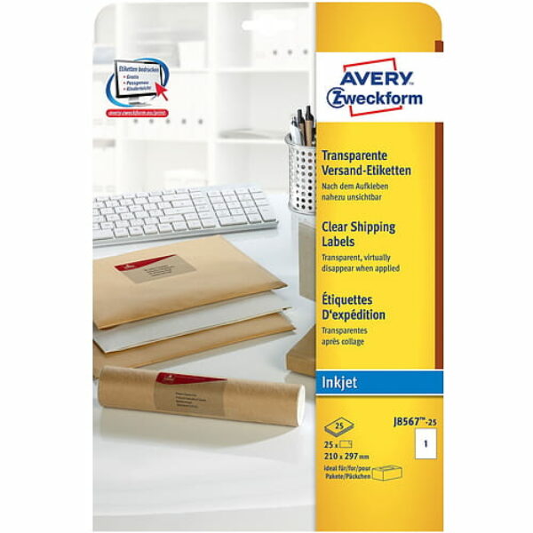 Etykiety wysyłkowe przezroczyste Avery Zweckform 210x297 mm J8567-25 przezroczyste