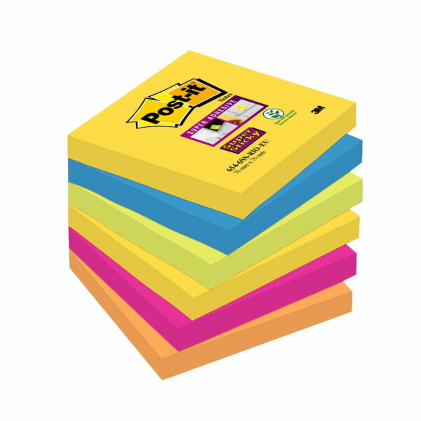 karteczki samoprzylepne Post-It Super Sticky posiadają mocniejszy klej niż standardowe karteczki, dzięki czemu doskonale przyklejają się do różnych powierzchni takich jak: monitory komputerowe, ściany, powierzchnie materiałowe itd.wymiary: 76X76mm90szt. karteczek w bloczkuwyjątkowe zestawy kolorów ułatwiają komunikację i wyróżnianie ważnych informacjipalety kolorów do wyboru: Bangkok (jaskrawy pomarańczowy, fuksja, niebieski); Bora Bora (czerwony, jaskrawy zielony, niebieski); Kapsztad (fuksja, jaskrawy zielony, żółty, jaskrawy pomarańczowy); Rio de Janeiro (żółty, niebieski, fuksja, jaskrawy zielony, jaskrawy pomarańczowy); Marrakesz (zielony, czerwony, niebieski, fioletowy, curry)