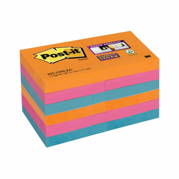 karteczki samoprzylepne Post-It Super Sticky posiadają mocniejszy klej niż standardowe karteczki, dzięki czemu doskonale przyklejają się do różnych powierzchni takich jak: monitory komputerowe, ściany, powierzchnie materiałowe itd.; wymiary: 51 x 51 mm; 90szt. karteczek w bloczku; wyjątkowe zestawy kolorów ułatwiają komunikację i wyróżnianie ważnych informacji; palety kolorów do wyboru: Bangkok (jaskrawy pomarańczowy, fuksja, niebieski); Bora Bora (czerwony, jaskrawy zielony, niebieski); opakowanie 12 sztuk