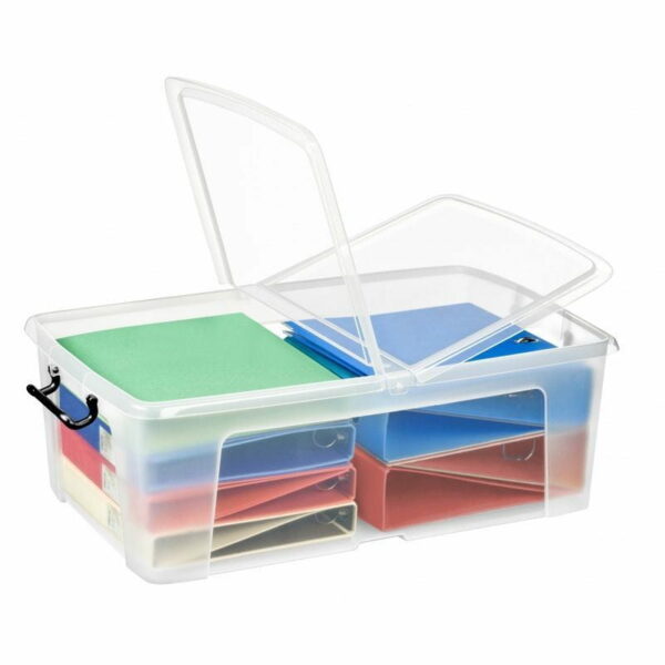 pojemnik biurowy, wykonany z odpornego, sztywnego polipropylenu w 100% nadającego się do dalszego recyklingudo przechowywania lub archiwizowania dokumentów lub innych przedmiotów - także do użytku domowegowyposażony w dwuczęściową pokrywę otwieraną z dwóch strondwa klipsy, umieszczone na przeciwnych biegunach, gwarantują solidne zamknięcie pojemnikadzięki konstrukcji można je ustawiać w poziomiepojemność: 50lwymiary: 450x695x241mmkolor transparentny