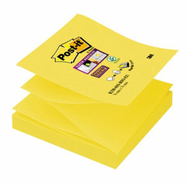 karteczki Post-It Super Sticky posiadają mocniejszy klej niż standardowe karteczki, dzięki czemu doskonale przyklejają się do różnych powierzchni takich jak: monitory komputerowe, ściany, powierzchnie materiałowe itd. system Z-Notes to karteczki w bloczku złożone w harmonijkę, dzięki czemu po wyciągnięciu jednej karteczki z podajnika, kolejne wysuwają się automatycznie paleta kolorów do wyboru: żółty; Bangkok (jaskrawy pomarańczowy, fuksja, niebieski); Bora Bora (czerwony, jaskrawy zielony, niebieski); Marrakesz (zielony, czerwony, niebieski, fioletowy, curry); Rio de Janeiro (żółty, niebieski, fuksja, jaskrawy zielony, jaskrawy pomarańczowy) wymiar: 76x76mm w każdym bloczku 90szt. karteczek