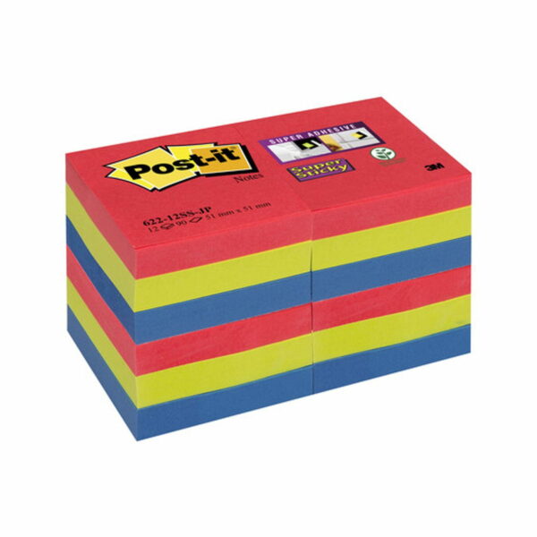 karteczki samoprzylepne Post-It Super Sticky posiadają mocniejszy klej niż standardowe karteczki, dzięki czemu doskonale przyklejają się do różnych powierzchni takich jak: monitory komputerowe, ściany, powierzchnie materiałowe itd.; wymiary: 47,6 x 47,6 mm; 90szt. karteczek w bloczku; wyjątkowe zestawy kolorów ułatwiają komunikację i wyróżnianie ważnych informacji; palety kolorów do wyboru: Bangkok (jaskrawy pomarańczowy, fuksja, niebieski); Bora Bora (czerwony, jaskrawy zielony, niebieski);
