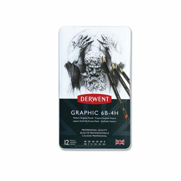 W pracy artystycznej, niezależnie od stylu i techniki, podstawą jest dobry ołówek. Derwent Graphic to najlepszy wybór dla każdego artysty. Te wysokiej jakości ołówki o tradycyjnym wyglądzie, produkowane są w gamie 20 twardości - od ostrych i precyzyjnych 9H do miękkich, łatwo rozmazujących się 9B. Dzięki sześciokątnej obudowie są wygodne w użyciu. Łatwo się je temperuje, tworząc ostrą, precyzyjną końcówkę. Komplet w solidnym metalowym opakowaniu zawiera 12 ołówków Derwent Graphic w następującej gradacji: 4H, 3H, 2H,H, F, HB, B, 2B ,3B ,4B ,5B i 6B.