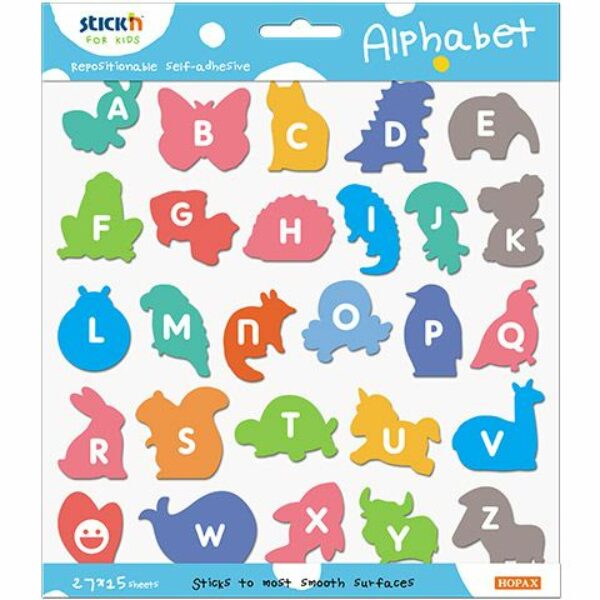 Kolorowe litery samoprzylepne Litery - 28 bloczków, każdy z 15 arkuszami idealne do nauki języka angielskiego i wczesnego rozpoznawania liter. Kartki w kształcie zwierząt. Z tyłu arkusza nazwy użytych zwierząt w języku angielskim. Zestaw zawiera 420 karteczek samoprzylepnych do wielokrotnego użytku.