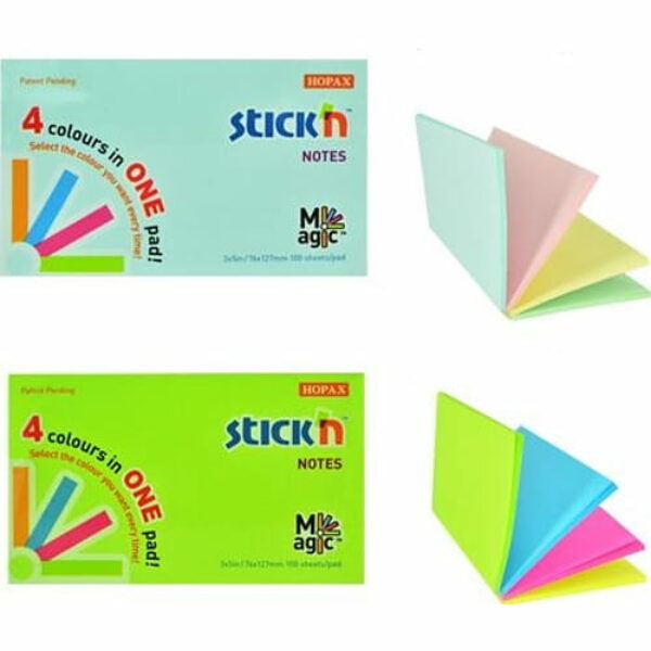 Notesy samoprzylepne Magic Pads to rewolucyjne rozwiązanie krawędź bloczka sklejona jest w sposób umożliwiający wyjmowanie karteczek w dowolnym kolorze bez konieczności rozrywania go. Bloczek o wymiarach 76 x 127 mm w 4 kolorach neonowych.