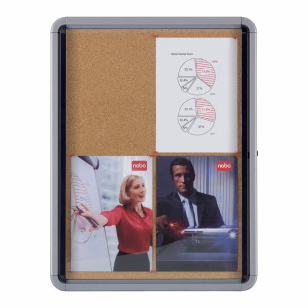 Korkowa gablota ogłoszeniowa ze szklanymi drzwiami zamykanymi z boku na klucz, obramowana nowoczesną, stylową aluminiową ramą, zapewni Ci idealną powierzchnię do przypinania i bezpiecznego eksponowania przygotowanych informacji. Mocowana do ściany w narożnikach. Rozmiar: 9 kartek A4.Gablota ogłoszeniowa z drzwiami wykonanymi z bezpiecznego szkła, zamykanymi z boku na kluczSamozasklepiająca się korkowa powierzchnia umożliwia przypinanie i bezpieczne eksponowanie przygotowanych informacjiRozmiar: 9 kartek A4, 709 x 970 mmObramowana nowoczesną, stylową aluminiową ramąMocowana do ściany w narożnikach10-letnia gwarancja