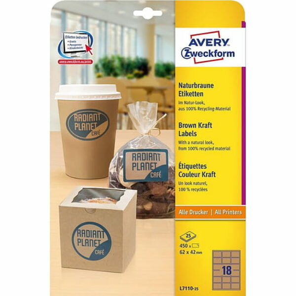 Brązowe etykiety na produkty• Naturalny i przyciągający uwagę kolor etykiety nadaje nowoczesny i ekologiczny wygląd oznaczonym przedmiotom.• Idealnie sprawdzają się podczas opisywania i ozdabiania produktów, czy też zamieszczania specyficznych informacji na opakowaniach.• Etykiety ekologiczne i przyjazne dla środowiska - zostały wykonane w 100% z materiałów pochodzących z recyklingu.• Dostępne w kilku rozmiarach oraz ciekawych kształtach: naklejki okrągłe, owalne i prostokątne.• Do zadruku w drukarkach atramentowych, laserowych, kolorowych laserowych oraz kopiarkach.• Darmowe i łatwe w użyciu szablony oraz oprogramowanie do projektowania etykiet jest dostępne na stronie www.avery-zweckform.pl
