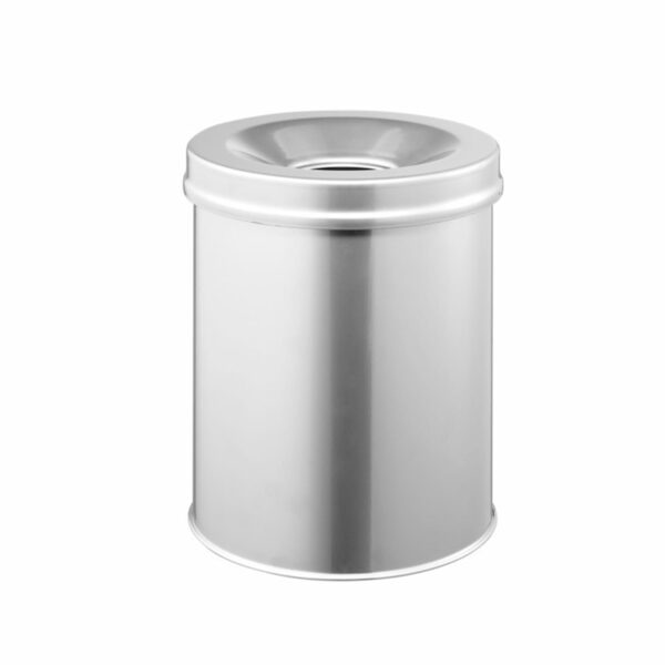 Okrągły kosz na śmieci z samo-gaszącą ogień pokrywą. Specjalna samo-gasząca ogień pokrywa odcina dopływ tlenu do kosza i tym samym stopniowo gasi płomienie. Wykonany z metalu, pokryty odporną na zadrapania powłoką epoksydową. Objętość: 15 l Wymiary: 357 x 260 mm. Kolor: srebrny