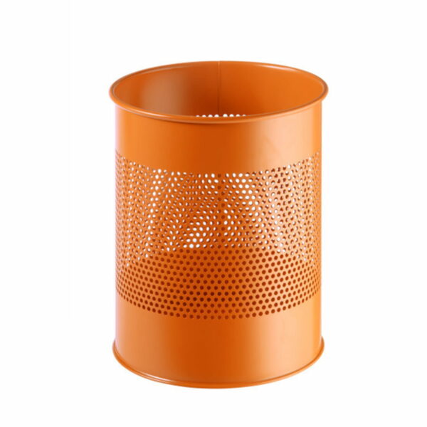 Metalowy kosz na śmieci, okrągły, pokryty odporną na zadrapania powłoką epoksydową. Dekoracyjna 165 mm perforacja. Pojemność: 15 l Wymiary 315 x 260 mm. Kolor: pomarańczowy