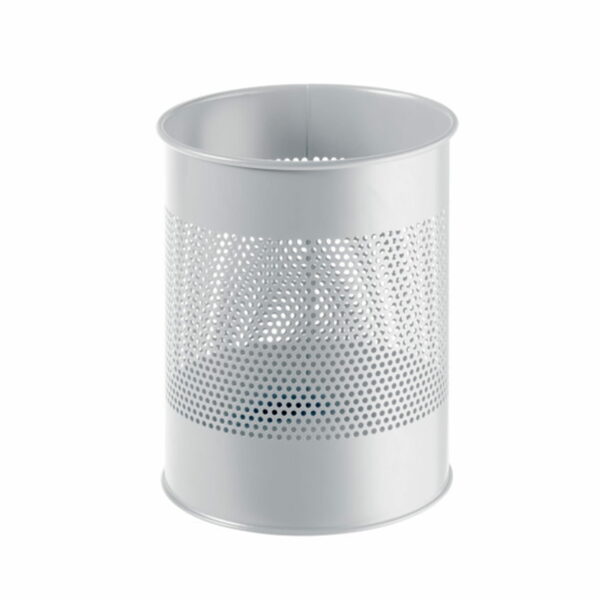 Metalowy kosz na śmieci, okrągły, pokryty odporną na zadrapania powłoką epoksydową. Dekoracyjna 165 mm perforacja. Pojemność: 15 l Wymiary 315 x 260 mm. Kolor: szary
