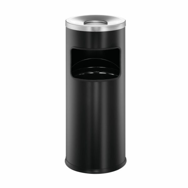 Elegancki okrągły 17-litrowy kosz na śmieci z 2-litrową popielnicą i samo-gaszącą ogień pokrywą. Wykonany z metalu. Specjalna samo-gasząca ogień pokrywa aluminiowa odcina dopływ tlenu do kosza i tym samym stopniowo gasi płomienie. Wymienny pojemnik wewnętrzny i popielniczka ułatwia opróżnianie i czyszczenie. Nadaje się do użytku w pomieszczeniach lub na zewnątrz pod zadaszeniem. Idealny do miejsc wyznaczonych dla osób palących oraz przy wejściu do budynku. Wymiary pokrywy samo-gaszącej (W x ): 60 x 240 mm Wymiary otworu z boku kosza (W x S): 125 x 150 mm. Wymiary pojemnika wewnętrznego (W x ): 380 x 220 mm. Wymiary produktu: 630 x 250 mm Kolor: czarny