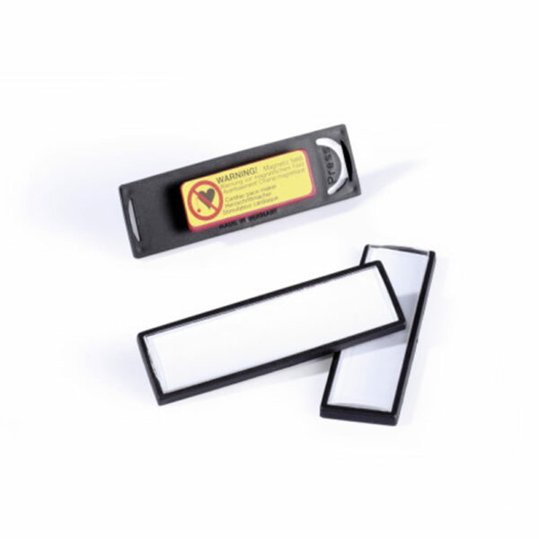 Wysokiej jakości ramka z tworzywa z przezroczystym, odpornym na zadrapania okienkiem zakrylu. Dobra widoczność osiągnięta dzięki sklepionemu okienku. Łatwe i chroniącemateriał zamocowanie nawet na delikatnej tkaninie. Magnes o szczególnie wysokiej sileprzyczepności. Na odwrocie karty informacja dla osób z rozrusznikiem serca.Wymiary: 17 x 67 mm, poziomy. Opakowanie: 25 sztuk.