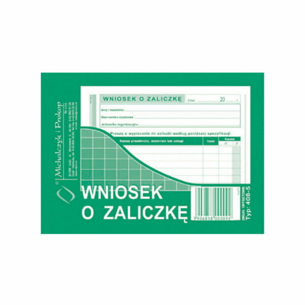 408-5 WNIOSEK O ZALICZKĘformat: A6rodzaj papieru: offsetowyzastosowanie: druki kasowe, księgowe i bankoweoprawa: bloczek 40 kartekdruk: dwustronny