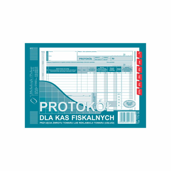 173-3E PROTOKÓŁ DLA KAS FISKALNYCH PRZYJĘCIA ZWROTU TOWARU LUB REKLAMACJI TOWARU (USŁUGI)format: A5rodzaj papieru: samokopiującyzastosowanie: faktury i inne dokumenty wynikające z przepisów o podatku od towarów i usługoprawa: bloczek 80 kartekdruk: jednostronny (oryginał + 1 kopia)