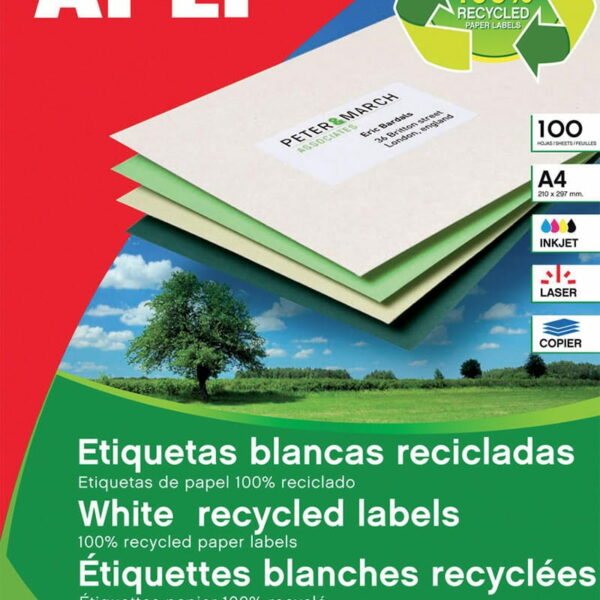 ekologiczne etykiety samoprzylepne do drukarek atramentowych, laserowych i kserokopiarek rozmiar etykiety: 105x37mm liczba etykiet na arkuszu: 16 gramatura: 143gsm (papier matowy) białość: 140 CIE etykiety oraz opakowanie wykonane z papieru otrzymanego w 100% z odzysku w 100% wolne od chloru (EFC) zawierają klej na bazie wody darmowy program do projektowania i wydruku etykiet APLI SOFT kompatybilny również z oprogramowaniem Windows 7 dostępny na apli.com lub pbspolska.eu 100 arkuszy w j.s. kolor biały