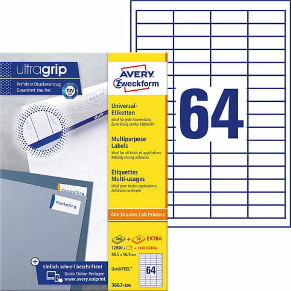 TRWAŁE ETYKIETY UNIWERSALNE DO WSZECHSTRONNYCH ZASTOSOWAŃ (papierowe; białe)- Posiadają unikalną i nowoczesną technologię UltraGrip: trójwymiarowa powierzchnia z tyłu arkusza gwarantuje równomierne pobieranie i prowadzenie arkusza w drukarce.- W opakowaniu znajduje się 20 dodatkowych arkuszy EXTRA!- Etykiety samoprzylepne do wszechstronnych zastosowań. Idealne do adresowania kopert i przesyłek pocztowych, oznaczania dokumentów, produktów i wielu innych zadań.- Przeznaczone do wszystkich typów drukarek atramentowych, laserowych oraz kserokopiarek.- Gwarancja braku zacięć w drukarkach laserowych przetestowana i zatwierdzona przez TÜV.- Ostry obraz bez rozmazywania tuszu i tonera.- Wybrane rozmiary posiadają unikalny system QuickPEEL ułatwiający odrywanie i szybsze przyklejanie etykiet.- Ekologiczne etykiety z certyfikatem FSC podlegające pełnej utylizacji jako odpad papierowy.- Mocny klej, dzięki czemu etykiety doskonale przylegają również do kartonów.- Darmowe i łatwe w użyciu szablony oraz oprogramowanie dostępne na stronie www.avery-zweckform.pl.Szablony i wzory do etykiet znajdziesz na stronie avery-zweckform.pl