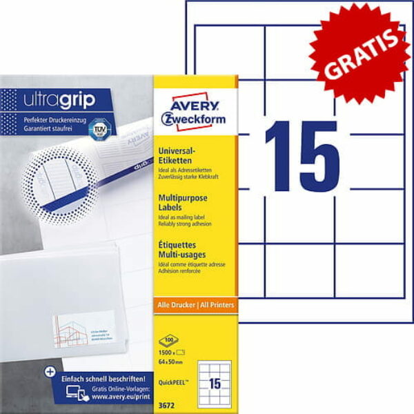 TRWAŁE ETYKIETY UNIWERSALNE DO WSZECHSTRONNYCH ZASTOSOWAŃ (papierowe; białe)- Posiadają unikalną i nowoczesną technologię UltraGrip: trójwymiarowa powierzchnia z tyłu arkusza gwarantuje równomierne pobieranie i prowadzenie arkusza w drukarce.- Etykiety samoprzylepne do wszechstronnych zastosowań. Idealne do adresowania kopert i przesyłek pocztowych, oznaczania dokumentów, produktów i wielu innych zadań.- Przeznaczone do wszystkich typów drukarek atramentowych, laserowych oraz kserokopiarek.- Gwarancja braku zacięć w drukarkach laserowych przetestowana i zatwierdzona przez TÜV.- Ostry obraz bez rozmazywania tuszu i tonera.- Wybrane rozmiary posiadają unikalny system QuickPEEL ułatwiający odrywanie i szybsze przyklejanie etykiet.- Ekologiczne etykiety z certyfikatem FSC podlegające pełnej utylizacji jako odpad papierowy.- Mocny klej, dzięki czemu etykiety doskonale przylegają również do kartonów.- Darmowe i łatwe w użyciu szablony oraz oprogramowanie dostępne na stronie www.avery-zweckform.pl.Szablony i wzory do etykiet znajdziesz na stronie avery-zweckform.pl