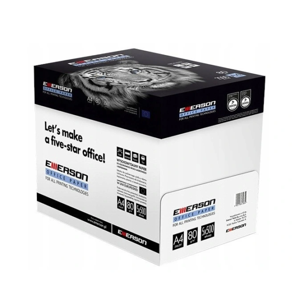Papier ksero A4 5 ryz Emerson karton gramatura: 80 g/m2 białość: 146 A4: 210x297 500 arkuszy/ryza karton 5 ryz, 2500 arkuszy Papier wyprodukowany w Unii Europejskiej cena dotyczy kartonu Papier uniwersalny, do wszystkich technologii druku: drukarki laserowe, atramentowe, kserokopiarki, fax.
