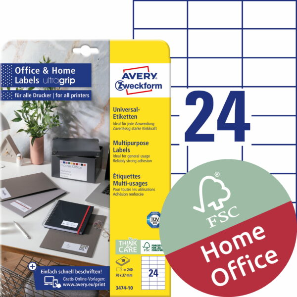 Trwałe etykiety uniwersalne do wszechstronnych zastosowań, np. na Home Office (papierowe; białe)• Etykiety samoprzylepne idealne m.in. do adresowania kopert i przesyłek pocztowych, oznaczania dokumentów, produktów i wielu innych zadań.• Opakowanie z niewielką ilością arkuszy (10 arkuszy/opakowanie) jest idealne dla osób, które będą używać etykiet w swoim domowym, kameralnym biurze.• Posiadają unikalną i nowoczesną technologię UltraGrip: trójwymiarowa powierzchnia z tyłu arkusza gwarantuje równomierne pobieranie i prowadzenie arkusza w drukarce.• Gwarancja braku zacięć w drukarkach laserowych przetestowana i zatwierdzona przez TÜV.• Ostry obraz bez rozmazywania tuszu i tonera.• Ekologiczne etykiety z certyfikatem FSC podlegające pełnej utylizacji jako odpad papierowy.• Mocny klej, dzięki czemu etykiety doskonale przylegają m.in. do papieru, tektury, szkła i plastiku.• Przeznaczone do wszystkich typów drukarek atramentowych, laserowych oraz kserokopiarek.• Darmowe i łatwe w użyciu szablony oraz oprogramowanie dostępne na stronie www.avery-zweckform.pl.