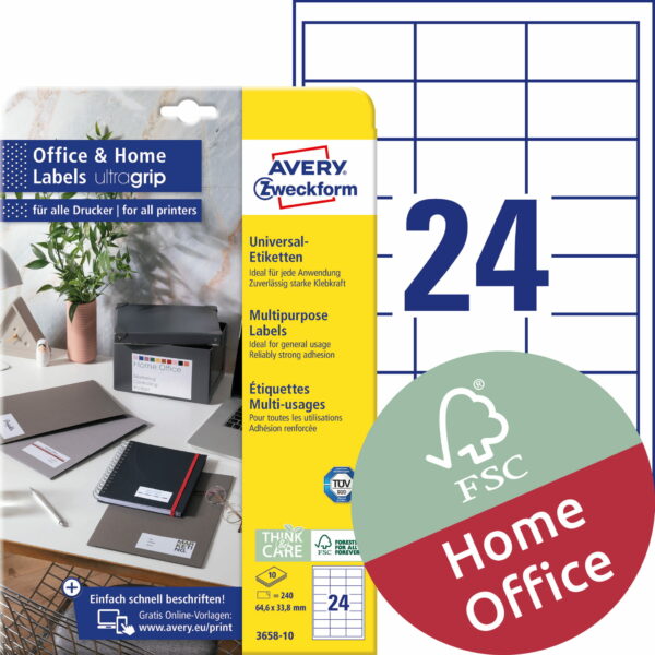 Trwałe etykiety uniwersalne do wszechstronnych zastosowań, np. na Home Office (papierowe; białe)• Etykiety samoprzylepne idealne m.in. do adresowania kopert i przesyłek pocztowych, oznaczania dokumentów, produktów i wielu innych zadań.• Opakowanie z niewielką ilością arkuszy (10 arkuszy/opakowanie) jest idealne dla osób, które będą używać etykiet w swoim domowym, kameralnym biurze.• Posiadają unikalną i nowoczesną technologię UltraGrip: trójwymiarowa powierzchnia z tyłu arkusza gwarantuje równomierne pobieranie i prowadzenie arkusza w drukarce.• Gwarancja braku zacięć w drukarkach laserowych przetestowana i zatwierdzona przez TÜV.• Ostry obraz bez rozmazywania tuszu i tonera.• Posiadają system QuickPEEL™ ułatwiający odklejanie od arkusza i szybsze przyklejanie etykiet do określonej powierzchni.• Ekologiczne etykiety z certyfikatem FSC podlegające pełnej utylizacji jako odpad papierowy.• Mocny klej, dzięki czemu etykiety doskonale przylegają m.in. do papieru, tektury, szkła i plastiku.• Przeznaczone do wszystkich typów drukarek atramentowych, laserowych oraz kserokopiarek.• Darmowe i łatwe w użyciu szablony oraz oprogramowanie dostępne na stronie www.avery-zweckform.pl.