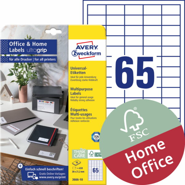 Trwałe etykiety uniwersalne do wszechstronnych zastosowań, np. na Home Office (papierowe; białe)• Etykiety samoprzylepne idealne m.in. do adresowania kopert i przesyłek pocztowych, oznaczania dokumentów, produktów i wielu innych zadań.• Opakowanie z niewielką ilością arkuszy (10 arkuszy/opakowanie) jest idealne dla osób, które będą używać etykiet w swoim domowym, kameralnym biurze.• Posiadają unikalną i nowoczesną technologię UltraGrip: trójwymiarowa powierzchnia z tyłu arkusza gwarantuje równomierne pobieranie i prowadzenie arkusza w drukarce.• Gwarancja braku zacięć w drukarkach laserowych przetestowana i zatwierdzona przez TÜV.• Ostry obraz bez rozmazywania tuszu i tonera.• Posiadają system QuickPEEL™ ułatwiający odklejanie od arkusza i szybsze przyklejanie etykiet do określonej powierzchni.• Ekologiczne etykiety z certyfikatem FSC podlegające pełnej utylizacji jako odpad papierowy.• Mocny klej, dzięki czemu etykiety doskonale przylegają m.in. do papieru, tektury, szkła i plastiku.• Przeznaczone do wszystkich typów drukarek atramentowych, laserowych oraz kserokopiarek.• Darmowe i łatwe w użyciu szablony oraz oprogramowanie dostępne na stronie www.avery-zweckform.pl.