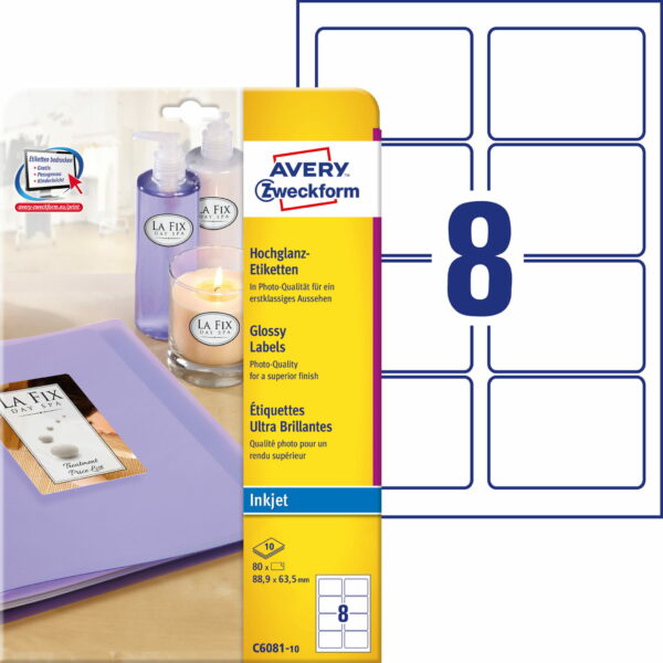 Etykiety błyszczące• Tekst i grafika na wysokobłyszczących etykietach wyróżniają się dzięki fotograficznej jakości wydruku o intensywnych kolorach i wyraźnych konturach.• Idealnie sprawdzają się podczas opisywania i ozdabiania produktów (mogą być używane jako naklejki na świeczki lub nalepki na flakony z kosmetykami), są też odpowiednie do zamieszczania ważnych informacji na opakowaniach (etykiety z logo, naklejki z podziękowaniami za zamówienie).• Błyszczące etykiety zapewniają także eleganckie wykończenie broszurom i katalogom.• Przeznaczone do zadruku w zwykłych, domowych drukarkach atramentowych.• Etykiety przyjazne dla środowiska – bielone bezchlorowo, bez PVC.• Darmowe i ławe w użyciu szablony oraz oprogramowanie do projektowania etykiet jest dostępne na stronie: www.avery-zweckform.pl