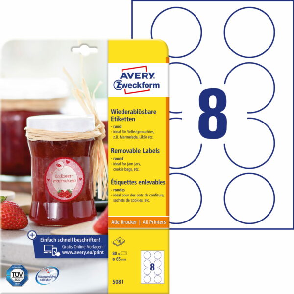 Usuwalne etykiety na przetwory• Białe, okrągłe etykiety samoprzylepne idealne do oznaczania np. słoików z przetworami, butelek z likierami i nalewkami, czy torebek z domowymi wypiekami itp.• Sprawdzają się także jako etykiety promocyjne, naklejki do czasowego oznaczania produktów oraz do dodawania nowych lub specyficznych informacji na opakowaniu. Są odpowiednie również do ogólnego oznaczania w biurze oraz w domu.• Niezawodnie przylegają do szkła, folii i papieru, ale jednocześnie są bardzo łatwe do usunięcia bez pozostałości śladów kleju. • Są przyjazne dla środowiska - posiadają certyfikat FSC®, czyli zostały wykonane z papieru pochodzącego z ekologicznie zarządzanych zasobów leśnych.• Etykiety przeznaczone do zadruku w zwykłych, domowych drukarkach atramentowych, laserowych, kolorowych laserowych oraz kopiarkach.• Bezpieczeństwo zadruku w drukarkach laserowych zostało przetestowane i zatwierdzone przez TUV.• Darmowe i łatwe w użyciu szablony oraz oprogramowanie do projektowania i wydruku etykiet jest dostępne na stronie www.avery-zweckform.pl