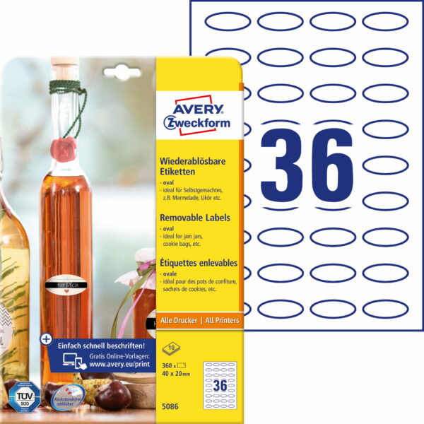 Usuwalne etykiety na przetwory• Białe, owalne etykiety samoprzylepne idealne do oznaczania np. słoików z przetworami, butelek z likierami i nalewkami, czy torebek z domowymi wypiekami itp.• Sprawdzają się także jako etykiety promocyjne, naklejki do czasowego oznaczania produktów oraz do dodawania nowych lub specyficznych informacji na opakowaniu. Są odpowiednie również do ogólnego oznaczania w biurze oraz w domu.• Niezawodnie przylegają do szkła, folii i papieru, ale jednocześnie są bardzo łatwe do usunięcia bez pozostałości śladów kleju. • Są przyjazne dla środowiska - posiadają certyfikat FSC®, czyli zostały wykonane z papieru pochodzącego z ekologicznie zarządzanych zasobów leśnych.• Etykiety przeznaczone do zadruku w zwykłych, domowych drukarkach atramentowych, laserowych, kolorowych laserowych oraz kopiarkach.• Bezpieczeństwo zadruku w drukarkach laserowych zostało przetestowane i zatwierdzone przez TUV.• Darmowe i łatwe w użyciu szablony oraz oprogramowanie do projektowania i wydruku etykiet jest dostępne na stronie www.avery-zweckform.pl