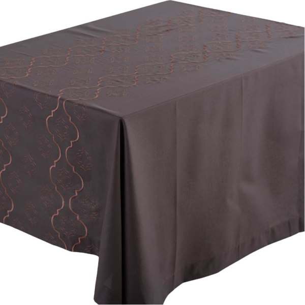 Obrus 70% bawełna 30% poliester. Obrus haftowany w kolorze brązowym. Występuje w rozmiarach 170x170, 170x270 170x350 oraz serwetka 45x45