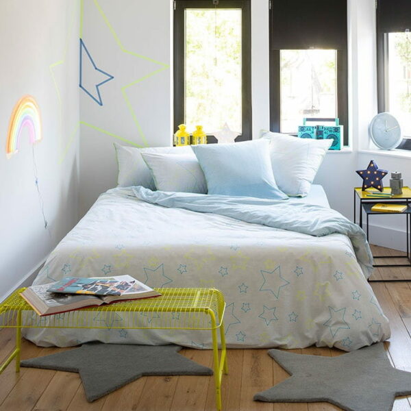 100% bawełny 57 nitek/cm2. Prawa strona poszwy na jasnoszarym tle namalowane zostały niebieskie gwiazdki oraz fluorescencyjne żółte. Druga strona poszwy jasnoszara z niebieskimi gwiazdkami.