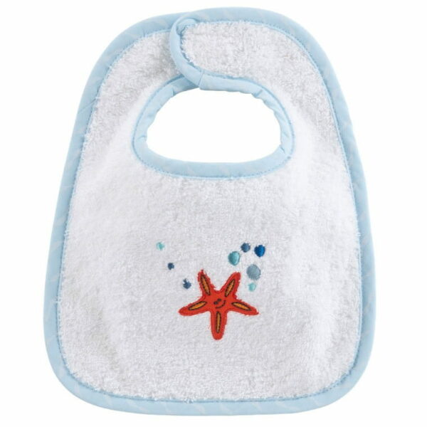 Śliniak haftowany, frotte, 100% bawełna o gramaturze 480 g/m2. Występują w kolorze białym i niebieskim z wyhaftowanym motywem serii. Zapinany na rzep.