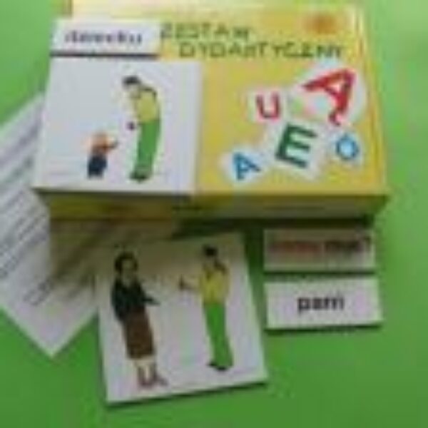 Zestawy plakietek i etykietek służy do przenoszenia obrazów z rzeczywistości na obrazki, uswiadamianiu dziecku, że słowo (napis) oznacza konkretną rzecz, czynność czy sytuację oraz do nauki czytania. Uczą dziecko rozumienia pytań oraz udzielania odpowiedzi.Zestaw "Komu daje?" służy do nauki zmiany końcówek rzeczownika w liczbie pojedynczej, która wymusza pytanie: Komu?, odpowiedzi na pytanie: Komu daje?Zestaw zawiera:- 5 elementów obrazkowych- 6 etykietek opisowych- opis przykładowych ćwiczeńZestaw "Czym jedzie?" służy do nauki zmiany końcówek rzeczownika w liczbie pojedynczej, którą wymusza pytanie: Czym?, nauki odpowiedzi na to pytanie, oraz do nauki czytania zdań dwuwyrazowych: Jedzie.......(Czym?)Zestaw zawiera:- 5 elementów obrazkowych- 6 etykietek opisowych- opis przykładowych ćwiczeńMateriał: tekturaOpakowanie: woreczek + pudełko tekturowe