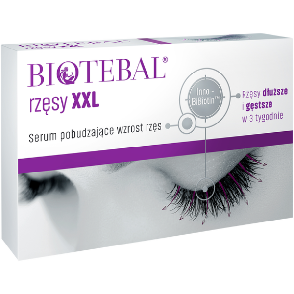 BIOTEBAL Rzęsy XXL serum pobudzające wzrost rzęs 3ml:specjalistyczne serum, które już po 3 tygodniach stosowania zapewnia efekt długich, pięknych i zdrowych rzęs,specjalna formuła Inno-BiBiotinTM, skutecznie, bezpiecznie wydłuża, pogrubia i wzmacnia rzęsy oraz brwi,Bimatoprost – znany i uważany obecnie na świecie za jeden z najskuteczniejszych składników pobudzających wzrost rzęs i hamujący proces ich wypadania. Regularnie stosowany sprawia, że rzęsy stają się dłuższe, grubsze i mocniejsze. Są bardziej elastyczne, lśniące i nabierają ciemniejszego koloru,Biotyna - witamina H- wywiera korzystny wpływ na stan włosów i tempo ich wzrostu. Jest skutecznym środkiem stymulującym wzrost rzęs i brwi,Pantenol - prowitamina B5 - odgrywa ważną rolę w pielęgnacji włosów, nadając im połysk i miękkość. Wygładza i pogrubia włókno włosa, chroni przed uszkodzeniami. Działa regenerująco,Polisacharydy - mają zdolność do zatrzymywania wody, co daje efekt natychmiastowego i długoterminowego nawilżenia. Zmniejszają nierówności powierzchni rzęs i brwi, naprawiają i wygładzają ich strukturę,Ekstrakt ze świetlika lekarskiego – ziołowy "kompres", posiada dobroczynne działanie na okolice oczu. Działa kojąco i nawilżająco, zmniejsza oznaki zmęczenia, zapobiega podrażnieniom,Peptydy – wywołują efekt dłuższych, gęstszych i mocniejszych rzęs. Zawarty w produkcie specjalnie wyselekcjonowany peptyd - Biotinoyl Tripeptide-1 wzmacnia włókna włosów, poprawiając kondycję rzęs,Ekstrakt z pestek dyni – wzmacnia rzęsy zapobiegając ich wypadaniu.