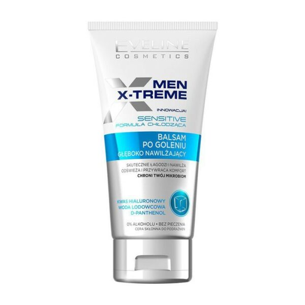 Eveline Men X-Treme Sensitive Głęboko Nawilżający Balsam Po GoleniuMen X-treme to balsam po goleniu dla mężczyzn. Natychmiast łagodzi podrażnienia i niweluje pieczenie wywołane goleniem. Działa jak chłodzący kompres, który regeneruje skórę i wspomaga odbudowę bariery ochronnej naskórka. W składzie znajduje się kwas hialuronowy, który odpowiada za wiązanie wody w naskórku, by zapobiegać przesuszeniu oraz woda lodowcowa, która skutecznie odświeża i zapewnia uczucie komfortu. Panthenol łagodzi podrażnienia i przynosi skórze ukojenie. regenerujełagodzikoiwygładzaSposób użycia: Stosuj każdorazowo po goleniu, ale także jako preparat do codziennej pielęgnacji skóry, szczególnie po umyciu twarzy mydłem lub żelem. Omijaj okolice oczu.Pojemność: 150ML