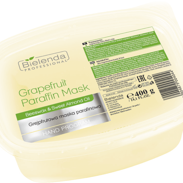 Bielenda Professional Grapefruit Paraffin Mask Beeswax & Almond Oil Grejpfrutowa Maska ParafinowaSzorstkie, twarde i piekące dłonie oraz chropowate i pękające pięty stóp to problemy, z którymi boryka się wiele osób. Dzięki masce parafinowej Bielenda Professional Grapefruit Paraffin Mask Beeswax & Sweet Almond Oil można błyskawicznie przywrócić zdrowy i atrakcyjny wygląd stwardniałych miejsc, podkreślić ich piękno i zapomnieć o krępujących niedoskonałościach.Zabieg z wykorzystaniem parafiny działa na naskórek niczym magiczny kompres. Olej ze słodkich migdałów intensywnie nawilża komórki, by parafinowa substancja mogła zabezpieczyć naskórek przed nadmierną utratą wody i odwodnieniem. Zastygająca substancja perfekcyjnie chroni przed przesuszeniem i działa w sposób odżywczo-regenerujący. Witamina E spowalnia proces starzenia, wygładza zmarszczki oraz niweluje wiotkość naskórka. Witamina C odpowiada za rozjaśnienie dłoni i stóp, wyrównanie ich kolorytu oraz usunięcie plam depigmentacyjnych. Poprawia także elastyczność, delikatnie złuszcza i chroni przed promieniowaniem UV. Olejek ze skórki grejpfruta normalizuje produkcję sebum, tonizuje oraz chroni przed powstawaniem stanów zapalnych. W efekcie dłonie i stopy stają się rozkosznie gładkie, miękkie, elastyczne, jedwabiste w dotyku i nieziemsko zadbane, a wszelki dyskomfort odchodzi w zapomnienie.Maska parafinowa Bielenda Professional Grapefruit Paraffin Mask Beeswax & Sweet Almond Oil z dodatkiem grejpfruta to szybki i profesjonalny sposób na poprawę wyglądu dłoni oraz stóp. Szorstkie i piekące obszary staną się odległym wspomnieniem.Uwaga! Produkt do użytku profesjonalnego.Pojemność: 400G