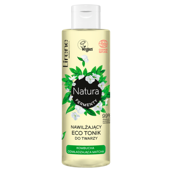 Lirene NATURA ECO Nawilżający tonik do twarzy Kombucha:przywraca odpowiednie pH skóry, łagodnie oczyszcza oraz koi nawet suchą, podrażnioną i zniszczoną cerę, Kombuchy (fermentowana czarna herbata) - wyjątkowy prebiotyk nawilża, ujędrnia oraz zawiera witaminy (B2, B6, B12 i C) oraz kwasy, zielona herbata Matcha niweluje uczucie ściągnięcia, dyskomfortu oraz przy długotrwałej aplikacji poprawia napięcie i kondycję skóry, pojemność 200ml.Sposób użycia: Oczyszczoną skórę twarzy i szyi przetrzyj wacikiem nasączonym tonikiem. Stosuj rano i wieczorem.